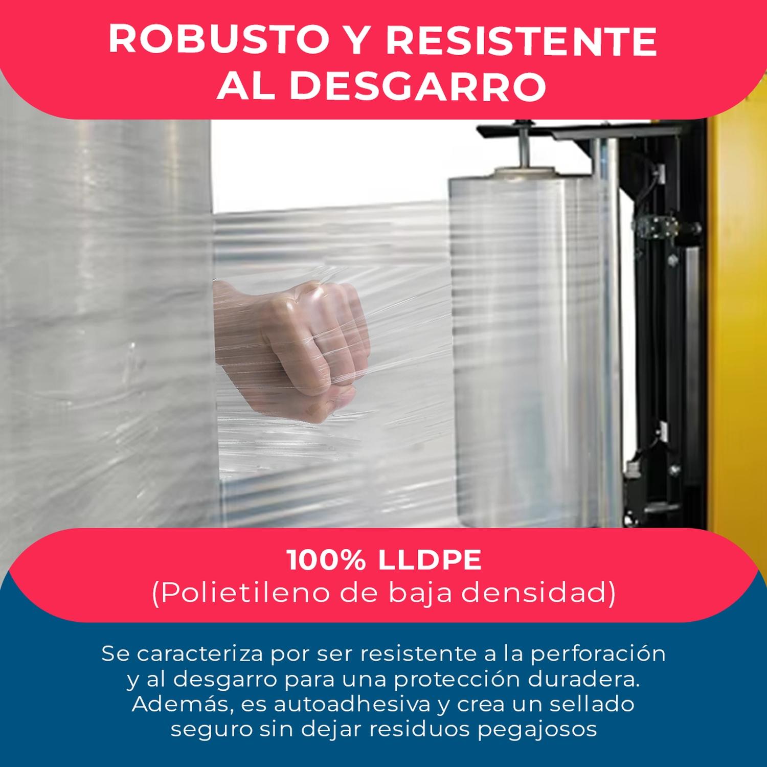 El Stretch Film Automático Transparente, esencial para empacar objetos, se elabora fusionando distintos polietilenos de baja densidad en una película transparente mediante tecnología avanzada, que incluye el control computarizado del grosor por capa. Su característica destacada es su excelente adherencia, facilitando la manipulación.